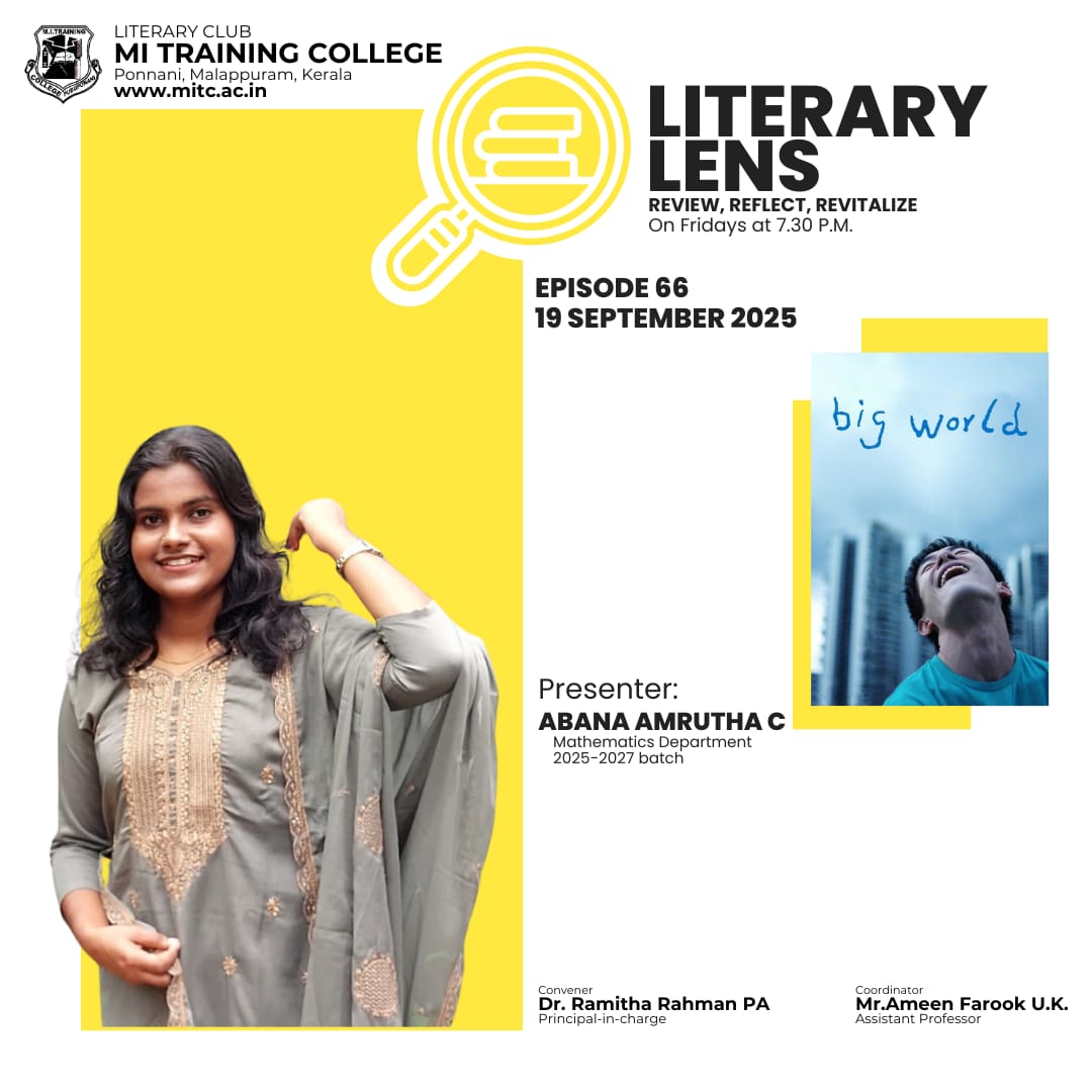 The sixty-sixth episode of the Literary Lens review series, organized by the Literary Club of MI Training College, Ponnani, was held on 19th September 2025 at 7:30 PM via Google Meet. The Literary Lens programme continues to serve as an innovative platform for student teachers to explore literary and cinematic works, fostering analytical thinking and creative appreciation.