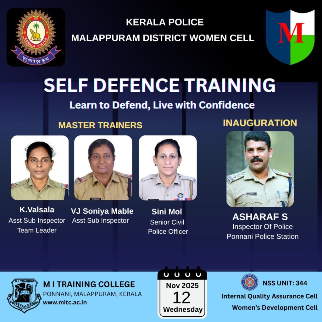 The Self Defence Training Programme was successfully organized by WDC AND NSS at M.I. Training College with the inspiring theme “Learn to Defend, Live with Confidence.” The event aimed to empower students with essential self-defence skills and to boost their confidence in handling challenging situations.