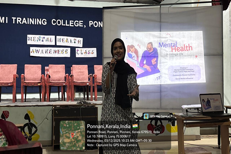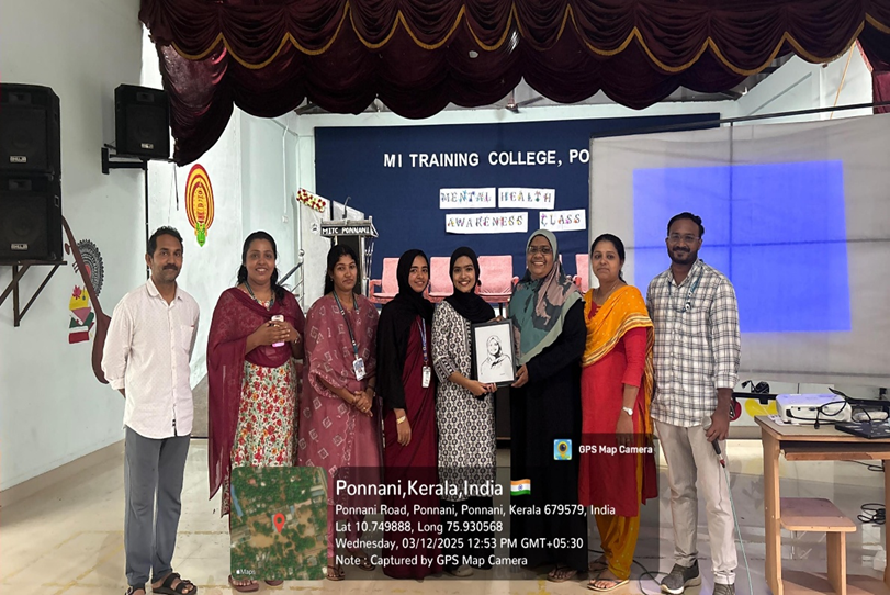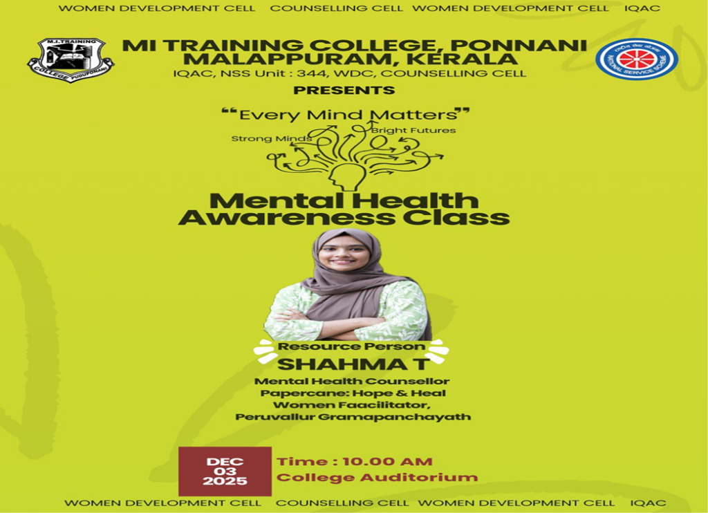 A Mental Health Awareness Class was organized by the Women Development Cell, Counselling cell and NSS Unit 344 of M.I Training College, Ponnani on 3rd December 2025. The programme was conducted at 10:00 am in the college auditorium. The theme of the class was “Strong Minds, Bright Futures.”